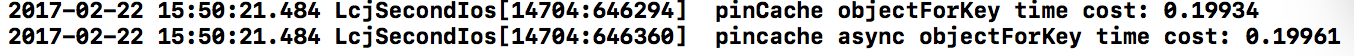 PINCache *pinCache=[PINCache sharedCache]; //模擬一個key NSString *key=@"key"; CFAbsoluteTime start = CFAbsoluteTimeGetCurrent(); //讀取數據 [pinCache objectForKey:key block:^(PINCache * _Nonnull cache, NSString * _Nonnull key, id _Nullable object) { CFAbsoluteTime end = CFAbsoluteTimeGetCurrent(); NSLog(@" pincache async objectForKey time cost: %0.5f", end - start); }] ; CFAbsoluteTime start1 = CFAbsoluteTimeGetCurrent(); [pinCache objectForKey:key]; CFAbsoluteTime end1 = CFAbsoluteTimeGetCurrent(); NSLog(@" pinCache objectForKey time cost: %0.5f", end1 - start1);運行結果: