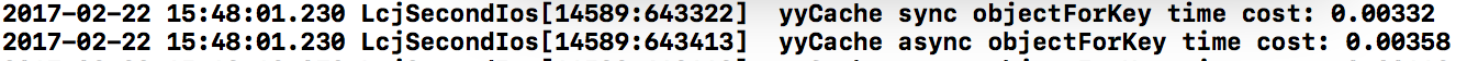 YYCache *yyCache=[YYCache cacheWithName:@"LCJCache"]; //模擬一個key NSString *key=@"key"; CFAbsoluteTime start = CFAbsoluteTimeGetCurrent(); //讀取數據 [yyCache objectForKey:key withBlock:^(NSString * _Nonnull key, id<NSCoding> _Nonnull object) { CFAbsoluteTime end = CFAbsoluteTimeGetCurrent(); NSLog(@" yyCache async objectForKey time cost: %0.5f", end - start); }]; CFAbsoluteTime start1 = CFAbsoluteTimeGetCurrent(); [yyCache objectForKey:key]; CFAbsoluteTime end1 = CFAbsoluteTimeGetCurrent(); NSLog(@" yyCache sync objectForKey time cost: %0.5f", end1 - start1);運行結果:
