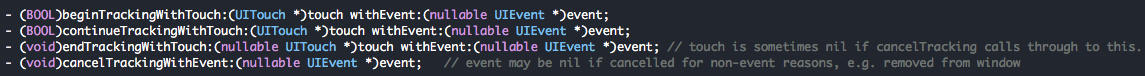 - (void)setScore:(CGFloat)score{ if (_score == score) { return; } _score = score; NSInteger index = floor(score); CGFloat fractionPart = score - index;; if (!self.isAllowFraction || fractionPart == 0) { index -= 1; } CDZStarButton *starButton = [self starForTag:index]; if (starButton.selected) { [self starsDownToIndex:index]; } else{ [self starsUpToIndex:index]; } starButton.fractionPart = fractionPart;}主要用到UIControl的四個方法
