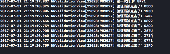 __weak typeof(self) weakSelf = self; /// 返回驗證碼數字 _testView.changeValidationCodeBlock = ^(void){ NSLog(@"驗證碼被點擊了:%@", weakSelf.testView.charString); };打印效果如下