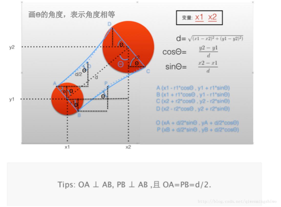 //獲取兩個(gè)圓之間的距離CGFloat distance = [self distanceWithSmallCircle:self.smallCircle bigCircle:self];if(distance<=MAX_DIST){//只有距離不超過(guò)最大距離才計(jì)算小圓半徑 //計(jì)算小圓的半徑 //小圓半徑最小的時(shí)候是MIN_RADIUS,這個(gè)時(shí)候兩個(gè)圓達(dá)到最大距離MAX_DIST //小圓半徑最大的時(shí)候是原始半徑,這個(gè)時(shí)候兩圓距離是0 //處于前面兩者之間的時(shí)候,小圓的半徑是:MIN_RADIUS + (原始半徑 - MIN_RADIUS)/MAX_DIST * (MAX_DIST - 當(dāng)前的距離) CGFloat smallR = self.bounds.size.width * 0.5; smallR = MIN_RADIUS + (MAX_DIST-distance) * (smallR-MIN_RADIUS)/MAX_DIST; //重新設(shè)置小圓的尺寸 self.smallCircle.bounds = CGRectMake(0, 0, smallR*2, smallR*2); //重新設(shè)置小圓的半徑 self.smallCircle.layer.cornerRadius = smallR;}else{//超過(guò)了最大距離 self.smallCircle.hidden = YES;}第五步:創(chuàng)建大小圓之間的連接部分。連接部分我們需要?jiǎng)?chuàng)建一個(gè)形狀圖層(CAShapeLayer)――它可以根據(jù)一個(gè)路徑生成一個(gè)形狀。