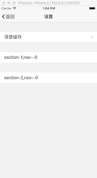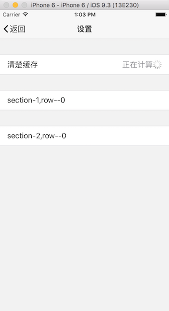 #import "GYLSettingViewController.h"#import "GYLClearCacheCell.h"@implementation GYLSettingViewControllerstatic NSString * const GYLClearCacheCellID = @"ClearCache";static NSString * const GYLSettingCellID = @"Setting";- (instancetype)init{ return [self initWithStyle:UITableViewStyleGrouped];}- (void)viewDidLoad{ [super viewDidLoad]; self.view.backgroundColor = GYLBGColor; self.navigationItem.title = @"設置"; [self.tableView registerClass:[GYLClearCacheCell class] forCellReuseIdentifier:GYLClearCacheCellID]; [self.tableView registerClass:[UITableViewCell class] forCellReuseIdentifier:GYLSettingCellID]; }- (NSInteger)numberOfSectionsInTableView:(UITableView *)tableView{ return 3;}- (NSInteger)tableView:(UITableView *)tableView numberOfRowsInSection:(NSInteger)section{ return 1;}- (UITableViewCell *)tableView:(UITableView *)tableView cellForRowAtIndexPath:(NSIndexPath *)indexPath{ if (indexPath.section == 0 && indexPath.row == 0) { return [[GYLClearCacheCell alloc] initWithStyle:UITableViewCellStyleValue1 reuseIdentifier:GYLClearCacheCellID]; } UITableViewCell *cell = [tableView dequeueReusableCellWithIdentifier:GYLSettingCellID]; cell.textLabel.text = [NSString stringWithFormat:@"section-%zd,row--%zd",indexPath.section,indexPath.row]; return cell;}@end7. 效果