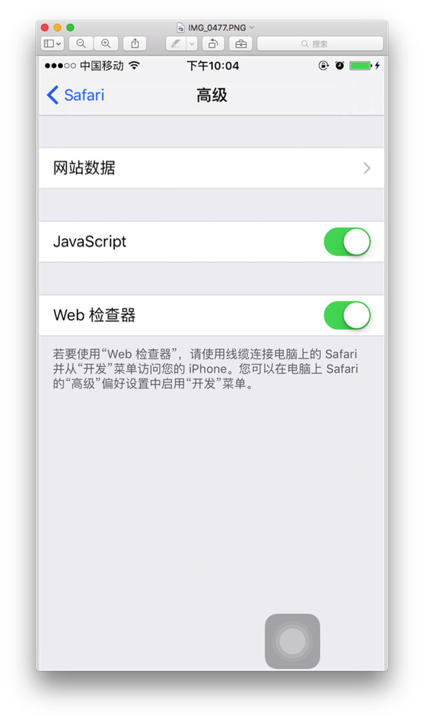 打開iPhone手機設置app 選擇Safari,找到高級選項,有JavaScript開關web檢查器開關,講兩個開關都打開
