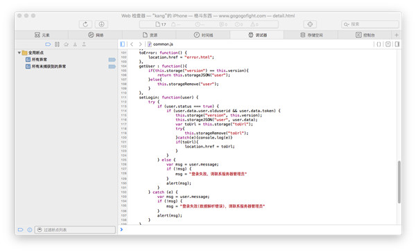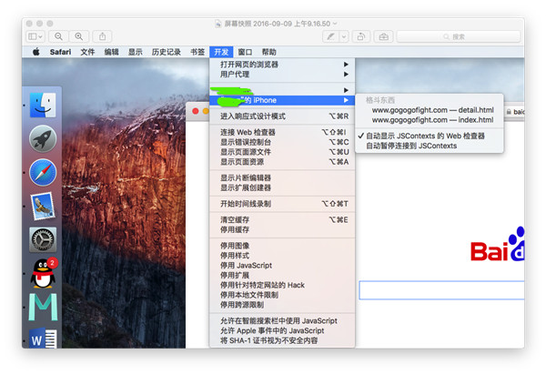 到此,準備工作完成。這時候講iPhone鏈接到mac上,打開Safari瀏覽器,運行手機app里面的web頁面,在開發菜單中選擇連接的手機,找到調試的網頁,就能在Safari里面調試了