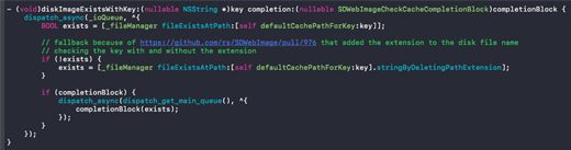 SDWebImageManager.shared().diskImageExists(for: imageUrl) { [weak self] (exist) in // Always on main thread guard self != nil else { return } if exist { // Find image data from disk var data: NSData? // Get cache key let key = SDWebImageManager.shared().cacheKey(for: imageUrl) // Get cache path if let path = SDImageCache.shared().defaultCachePath(forKey: key) { data = NSData(contentsOfFile: path) if data == nil { data = NSData(contentsOfFile: (path as NSString).deletingPathExtension) } } if data != nil { // Get image data } else { // Fail getting image data } } else { // No disk image }}這個方法缺點在于,代碼復雜,可能會在 SDWebImage 版本升級后失效(例如,Disk 緩存路徑改變)。