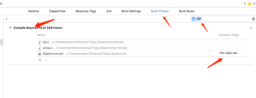 給ZipArchive.mm文件添加一個 -fno-objc-arc 標簽就可以了