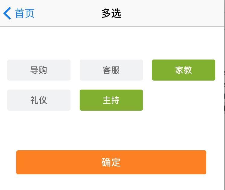 - (void)setupMultiselectView { CGFloat UI_View_Width = [UIScreen mainScreen].bounds.size.width; CGFloat marginX = 15; CGFloat top = 19; CGFloat btnH = 35; CGFloat marginH = 40; CGFloat height = 130; CGFloat width = (UI_View_Width - marginX * 4) / 3; // 按鈕背景 UIView *btnsBgView = [[UIView alloc] initWithFrame:CGRectMake(0, 100, UI_View_Width, height)]; btnsBgView.backgroundColor = [UIColor whiteColor]; [self.view addSubview:btnsBgView]; // 循環創建按鈕 NSInteger maxCol = 3; for (NSInteger i = 0; i < 5; i++) { UIButton *btn = [UIButton buttonWithType:UIButtonTypeCustom]; btn.backgroundColor = ZLUnselectedColor; btn.layer.cornerRadius = 3.0; // 按鈕的邊框弧度 btn.clipsToBounds = YES; btn.titleLabel.font = [UIFont boldSystemFontOfSize:14]; [btn setTitleColor:[UIColor colorWithRed:(102)/255.0 green:(102)/255.0 blue:(102)/255.0 alpha:1.0] forState:UIControlStateNormal]; [btn setTitleColor:[UIColor whiteColor] forState:UIControlStateSelected]; [btn addTarget:self action:@selector(chooseMark:) forControlEvents:UIControlEventTouchUpInside]; NSInteger col = i % maxCol; //列 btn.x = marginX + col * (width + marginX); NSInteger row = i / maxCol; //行 btn.y = top + row * (btnH + marginX); btn.width = width; btn.height = btnH; [btn setTitle:self.markArray[i] forState:UIControlStateNormal]; [btnsBgView addSubview:btn]; } // 確定按鈕 UIButton *surebtn = [UIButton buttonWithType:UIButtonTypeCustom]; [surebtn setTitle:@"確定" forState:UIControlStateNormal]; surebtn.frame = CGRectMake(marginX * 2, CGRectGetMaxY(btnsBgView.frame) + marginH, UI_View_Width - marginX * 4, 40); surebtn.titleLabel.font = [UIFont boldSystemFontOfSize:16]; [surebtn addTarget:self action:@selector(sureBtnClick) forControlEvents:UIControlEventTouchUpInside]; surebtn.backgroundColor = [UIColor orangeColor]; surebtn.layer.cornerRadius = 3.0; surebtn.clipsToBounds = YES; [self.view addSubview:surebtn];}3. 按鈕多選邏輯處理, 并上傳數據請求處理