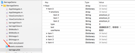 emotions存放這條彈幕的表情,type表示是否是自己發的,text表示彈幕內容,userName表示用戶昵稱。取出plist文件的數據并轉換成model。
