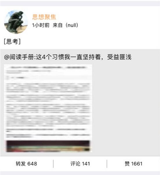 /** * 獲取cell的高度 * * @param weibo weibo * * @return height */+ (CGFloat)getCellHeight:(WeiboModel *)weibo {CGFloat contentHeight = [FitBoUI getLabelHeightWithText:weibo.text width:UI_SCREEN_WIDTH - LeadingSpace * 2 font:FontSize12];CGFloat originY = ContentLabelOriginY + contentHeight + LeadingSpace;if (weibo.retweeted_status == nil) { //原創微博 CGFloat imageHeight = [self getImageHeight:weibo.pic_urls.count]; return originY + imageHeight + LeadingSpace + ButtonHeight;}else { //非原創微博 WeiboModel *forwardWeibo = weibo.retweeted_status; NSString *forwardText = [NSString stringWithFormat:@"@%@:%@", forwardWeibo.user.name, forwardWeibo.text]; CGFloat imageHeight = [self getImageHeight:forwardWeibo.pic_urls.count]; CGFloat forwardContentHeight = [FitBoUI getLabelHeightWithText:forwardText width:UI_SCREEN_WIDTH - LeadingSpace * 2 font:FontSize12]; return originY + LeadingSpace + forwardContentHeight + imageHeight + LeadingSpace * 2 + ButtonHeight;}}//獲取圖片的整體高度+ (CGFloat)getImageHeight:(NSInteger)count {if (count < 1) { //上面計算高度的時候預留了配圖上下兩個間隙的高度。所以,如果沒有配圖,返回 - LeadingSpace才合適。 return - LeadingSpace;}else if (count == 1) { return UI_SCREEN_WIDTH * 0.55;}else if (count / 3 < 1 || count == 3) { //一行 return (UI_SCREEN_WIDTH - (LeadingSpace + ImageSpace) * 2) / 3;}else if (count > 3 && count <= 6) { //兩行 return (UI_SCREEN_WIDTH - (LeadingSpace + ImageSpace) * 2) / 3 * 2 + ImageSpace;}else { //三行 return (UI_SCREEN_WIDTH - (LeadingSpace + ImageSpace) * 2) + ImageSpace * 2;}}其他的點擊事件的響應方法等,就不累贅了。最后再放一張非原創微博的效果圖: