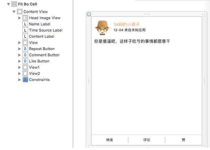 每條微博的共同部分包括:頭像,用戶名稱,發布時間與發布來源,微博正文,底部的轉發,評論,贊。不同的部分有:配圖,非原創微博的正文。(視頻,文章等在這個項目中不做考慮)所以共同部分可以直接在xib上固定,不同部分則需要在.m文件用代碼來寫。