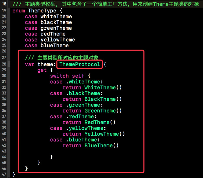 主題協議已經主題類構建完畢后,接下來我們就該將這些主題進行打包輸出了。 下方的代碼段本質上就是主題類的簡單工廠,因為Swift的枚舉類型有很多好用的特性,所以我們使用了Swift的枚舉來實現這些主題的簡單工廠。代碼結構比較簡單,在此就不做過多贅述了。