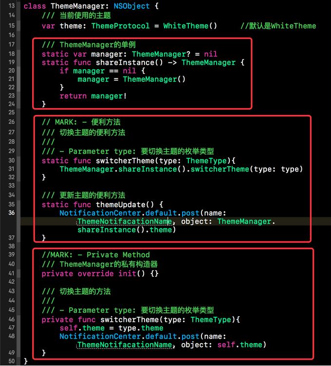 下方就是我們主題管理者ThemeManager的具體實現代碼,ThemeManager是以單例的姿態對外展現的。因為主題管理者在整個App運行時只需要一個,所以我們賦予了ThemeManager一個單例的身份與用戶進行交流。單例實現完畢后,接著社一些便利方法,這些便利方法都是靜態方法,便于用戶直接使用。接著是一些ThemeManager的私有方法。