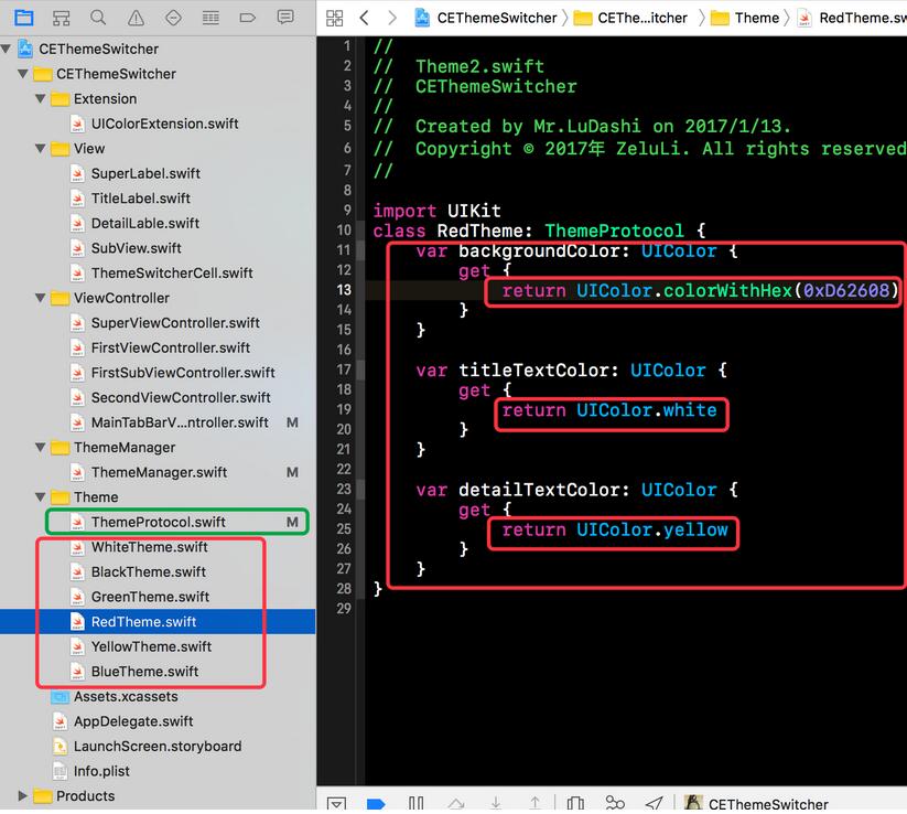 接下來我們就要看看各個主題的實現了,我們就以紅色主題(RedTheme)為例。RedTheme要遵循ThemeProtocol,并且實現協議中規定的方法。在RedTheme中每個計算屬性都會返回當前主題所對應的屬性。具體如下所示。當然其他主題與下方的RedTheme類似,只是每個計算屬性返回的值不同。