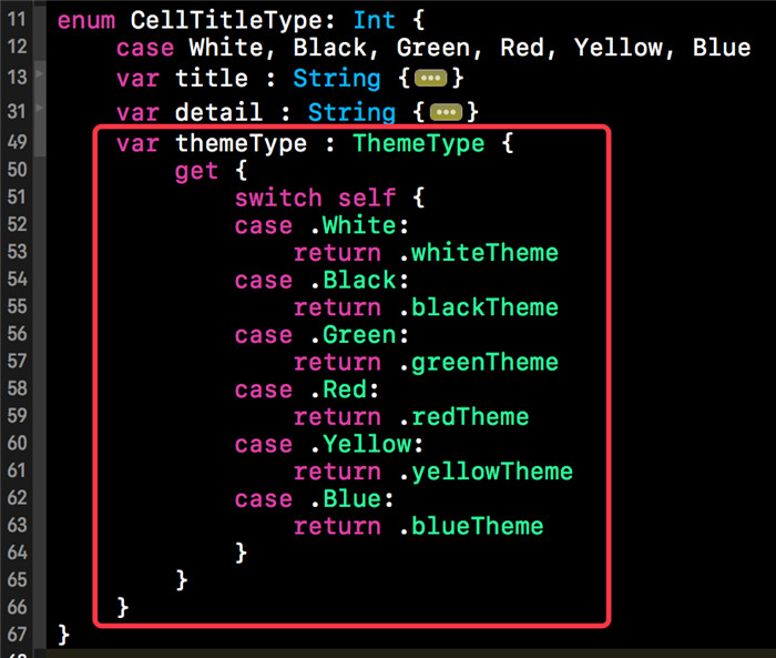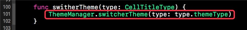 萬事俱備只欠東風,接下來我們就要在恰當的地方調用ThemeManager的switcherTheme()的方法進行替換了。當然我們是在我們的Cell來處理的,因為每種cell都對應著主題的類型,下方就是Cell類型的枚舉。CellTitleType中的themeType計算屬性就對應著相應的主題類型,我們可以將該類型提供給ThemeManager,讓后ThemeManager發出更改主題的通知。