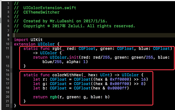 上面在返回UIColor對象時,我們用到了UIColor.colorWithHex(十六進制數)。colorWithHex()是我們在UIColor的延展中添加的靜態方法,該方法可以根據十六進制的RGB參數來初始化相應的UIColor對象。下方是該UIColor延展中的具體內容。下方代碼的核心就是位操作的使用。