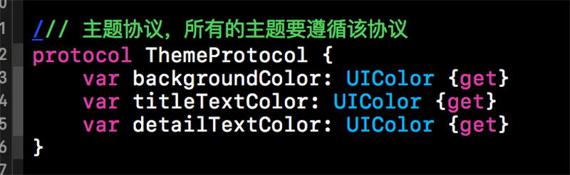 下方就是我們定義的主題協議,所有主題都要遵循該協議。因為本篇博客的Demo在切換主題時只涉及到了三個元素,一個是背景色(backgroundColor),一個是標題的顏色(titleTextColor),在一個就是詳情的顏色(detailTextColor)。所以在我們的主題協議中有三個只讀的計算屬性與之對應。具體如下所示: