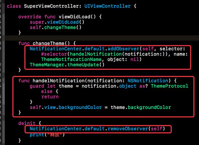 主題以及主題管理者實現完畢,接下來就該使用了。在主題切換時,需要修改屬性的控件我們需要進行處理,使其監聽主題切換的通知,并根據通知內容修改控件的屬性。在本部分我們就以SuperViewController為例。首先我們要將SuperViewController添加為主題切換的觀察者,然后實現收到通知后的方法。在析構函數中,切記要移除觀察者。具體代碼如下所示。