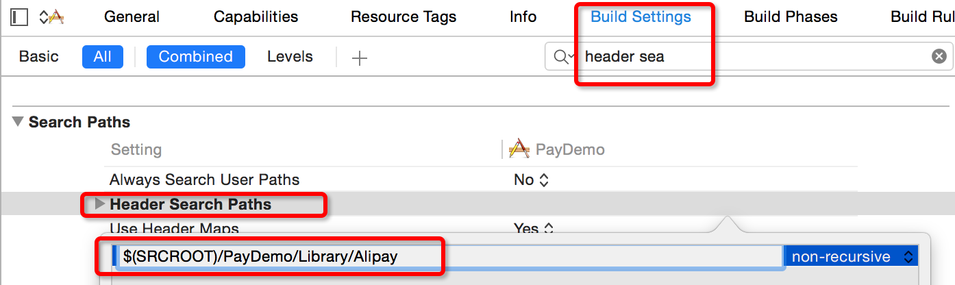 點擊項目名稱,點擊“Build Settings”選項卡,在搜索框中,以關鍵字“search”搜索,對“Header Search Paths”增加頭文件路徑:$(SRCROOT)/項目名稱。如果頭文件信息已增加,可不必再增加。