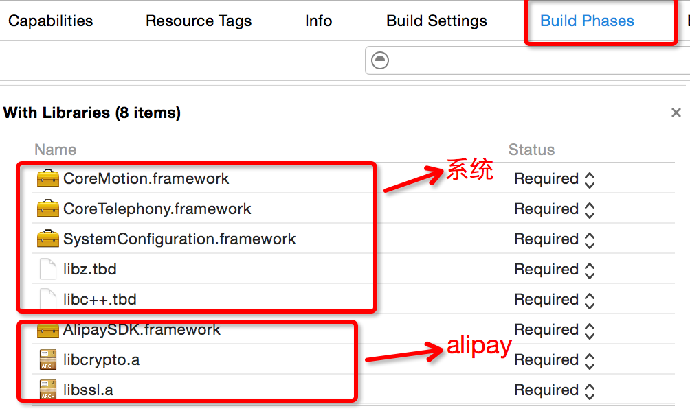 2.在xcode中,點擊項目名,選擇Build Phases -->Link Binary With Libraries 添加依賴庫。
