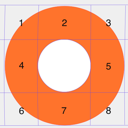 對于這個需求,我一開始也陷入了寫死數(shù)據(jù)的套路,但是在兼容大小圓半徑上做了一定的兼容,大致的將大圓切分成 9塊 ,然后在除了中間區(qū)域外的8塊區(qū)域再生成一系列的偽標(biāo)準(zhǔn)圓。然后取值時現(xiàn)隨機(jī)選取8塊區(qū)域,再隨機(jī)從塊區(qū)拿取 偽標(biāo)準(zhǔn)圓 :
