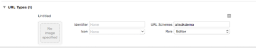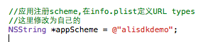 - (BOOL)application:(UIApplication *)app openURL:(NSURL *)url options:(NSDictionary<NSString*, id> *)options{ [[AlipaySDK defaultService] processOrderWithPaymentResult:url standbyCallback:^(NSDictionary *resultDic) { NSLog(@"result = %@",resultDic);//返回的支付結果 //【由于在跳轉支付寶客戶端支付的過程中,商戶app在后臺很可能被系統kill了,所以pay接口的callback就會失效,請商戶對standbyCallback返回的回調結果進行處理,就是在這個方法里面處理跟callback一樣的邏輯】 }]; return YES;}(2)點擊項目名稱,點擊“Info”選項卡,在“URL Types”選項中,點擊“+”,在“URL Schemes”中輸入自己的APP標示,如:“alisdkdemo”。“alisdkdemo”來自于以下代碼: