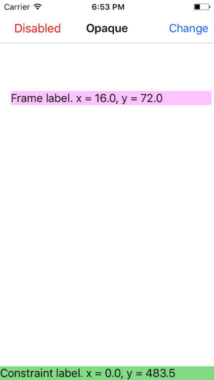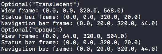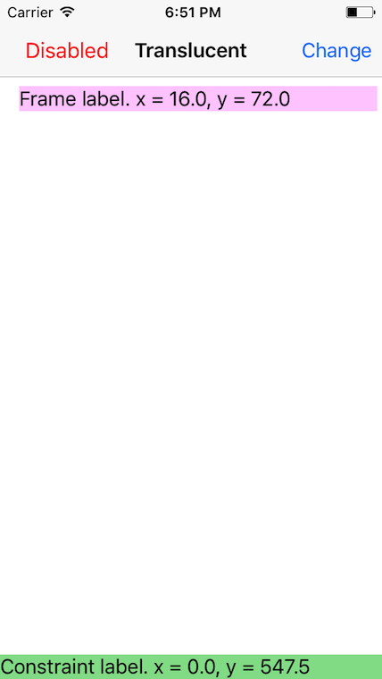 @objc private func rightButtonClicked(_ sender: AnyObject) {navigationController?.navigationBar.isTranslucent = !navigationController!.navigationBar.isTranslucent updateLabelContent()}private func updateLabelContent() { title = navigationController!.navigationBar.isTranslucent ? "Translecent" : "Opaque" let frameLabelOrigin = frameLabel.frame.origin frameLabel.text = "Frame label. x = /(frameLabelOrigin.x), y = /(frameLabelOrigin.y)" let constraintLabelOrigin = constraintLabel.frame.origin constraintLabel.text = "Constraint label. x = /(constraintLabelOrigin.x), y = /(constraintLabelOrigin.y)" print("/(title)") print("Status bar frame:", UIApplication.shared.statusBarFrame) // (0.0, 0.0, 375.0, 20.0) print("Navigation bar frame:", navigationController!.navigationBar.frame) // (0.0, 20.0, 375.0, 44.0)}通過點擊右上角按鈕,來查看變化。