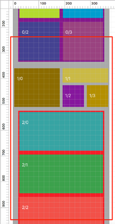 根據(jù)DataSource的Delegate,拿到所有的View應(yīng)該被顯示的位置。這一步,核心是拿到的位置是確定的。根據(jù)Demo,我們觀察從 0/1 - 2/3 之間這些View,這個(gè)時(shí)候LazyScrollView拿到的Rect如下: