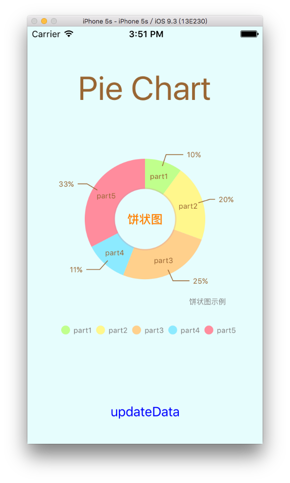 - (PieChartData *)setData{ double mult = 100; int count = 5;//餅狀圖總共有幾塊組成 //每個區塊的數據 NSMutableArray *yVals = [[NSMutableArray alloc] init]; for (int i = 0; i < count; i++) { double randomVal = arc4random_uniform(mult + 1); BarChartDataEntry *entry = [[BarChartDataEntry alloc] initWithValue:randomVal xIndex:i]; [yVals addObject:entry]; } //每個區塊的名稱或描述 NSMutableArray *xVals = [[NSMutableArray alloc] init]; for (int i = 0; i < count; i++) { NSString *title = [NSString stringWithFormat:@"part%d", i+1]; [xVals addObject:title]; } //dataSet PieChartDataSet *dataSet = [[PieChartDataSet alloc] initWithYVals:yVals label:@""]; dataSet.drawValuesEnabled = YES;//是否繪制顯示數據 NSMutableArray *colors = [[NSMutableArray alloc] init]; [colors addObjectsFromArray:ChartColorTemplates.vordiplom]; [colors addObjectsFromArray:ChartColorTemplates.joyful]; [colors addObjectsFromArray:ChartColorTemplates.colorful]; [colors addObjectsFromArray:ChartColorTemplates.liberty]; [colors addObjectsFromArray:ChartColorTemplates.pastel]; [colors addObject:[UIColor colorWithRed:51/255.f green:181/255.f blue:229/255.f alpha:1.f]]; dataSet.colors = colors;//區塊顏色 dataSet.sliceSpace = 0;//相鄰區塊之間的間距 dataSet.selectionShift = 8;//選中區塊時, 放大的半徑 dataSet.xValuePosition = PieChartValuePositionInsideSlice;//名稱位置 dataSet.yValuePosition = PieChartValuePositionOutsideSlice;//數據位置 //數據與區塊之間的用于指示的折線樣式 dataSet.valueLinePart1OffsetPercentage = 0.85;//折線中第一段起始位置相對于區塊的偏移量, 數值越大, 折線距離區塊越遠 dataSet.valueLinePart1Length = 0.5;//折線中第一段長度占比 dataSet.valueLinePart2Length = 0.4;//折線中第二段長度最大占比 dataSet.valueLineWidth = 1;//折線的粗細 dataSet.valueLineColor = [UIColor brownColor];//折線顏色 //data PieChartData *data = [[PieChartData alloc] initWithXVals:xVals dataSet:dataSet]; NSNumberFormatter *formatter = [[NSNumberFormatter alloc] init]; formatter.numberStyle = NSNumberFormatterPercentStyle; formatter.maximumFractionDigits = 0;//小數位數 formatter.multiplier = @1.f; [data setValueFormatter:formatter];//設置顯示數據格式 [data setValueTextColor:[UIColor brownColor]]; [data setValueFont:[UIFont systemFontOfSize:10]]; return data;}運行結果如下: