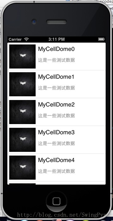 #import "TableViewController.h" #import "TableViewCell.h" @interface TableViewController (){ NSMutableArray *tableData; //表格數據 } @end @implementation TableViewController - (id)initWithStyle:(UITableViewStyle)style { self = [super initWithStyle:style]; if (self) { // Custom initialization } return self; } - (void)viewDidLoad { [super viewDidLoad]; //初始化表格數據 tableData = [[NSMutableArray alloc] init]; for (int i = 0; i< 10; i++) { [tableData addObject:[NSString stringWithFormat:@"MyCellDemon%i",i]]; } //設置row的高度為自定義cell的高度 self.tableView.rowHeight = 90; } - (void)didReceiveMemoryWarning { [super didReceiveMemoryWarning]; } #pragma mark - Table view data source - (NSInteger)numberOfSectionsInTableView:(UITableView *)tableView { #warning Potentially incomplete method implementation. return 1; } - (NSInteger)tableView:(UITableView *)tableView numberOfRowsInSection:(NSInteger)section { #warning Incomplete method implementation. return [tableData count]; } - (UITableViewCell *)tableView:(UITableView *)tableView cellForRowAtIndexPath:(NSIndexPath *)indexPath { //指定cellIdentifier為自定義的cell static NSString *CellIdentifier = @"TableViewCell"; //自定義cell類 TableViewCell *cell = [tableView dequeueReusableCellWithIdentifier:CellIdentifier]; if (cell == nil) { //通過xib的名稱加載自定義的cell cell = [[[NSBundle mainBundle] loadNibNamed:@"TableViewCell" owner:self options:nil] lastObject]; } //添加測試數據 cell.titleLabel.text = [tableData objectAtIndex:indexPath.row]; cell.content.text = @"這是一些測試數據"; //測試圖片 cell.iamge.image = [UIImage imageNamed:@"testImage.jpg"]; return cell; } #pragma mark - Table view delegate - (void)tableView:(UITableView *)tableView didSelectRowAtIndexPath:(NSIndexPath *)indexPath { } @end 最終效果: