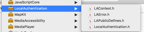 //// LAPublicDefines.h// LocalAuthentication//// Copyright (c) 2014 Apple. All rights reserved.//#ifndef LocalAuthentication_LAPublicDefines_h#define LocalAuthentication_LAPublicDefines_h// Policies#define kLAPolicyDeviceOwnerAuthenticationWithBiometrics 1#define kLAPolicyDeviceOwnerAuthentication 2// Options#define kLAOptionUserFallback 1#define kLAOptionAuthenticationReason 2// Credential types#define kLACredentialTypePasscode -1#define kLACredentialTypePassphrase -2#define kLACredentialCTKPIN -3// Error codes#define kLAErrorAuthenticationFailed -1#define kLAErrorUserCancel -2#define kLAErrorUserFallback -3#define kLAErrorSystemCancel -4#define kLAErrorPasscodeNotSet -5#define kLAErrorTouchIDNotAvailable -6#define kLAErrorTouchIDNotEnrolled -7#define kLAErrorTouchIDLockout -8#define kLAErrorAppCancel -9#define kLAErrorInvalidContext -10// Error domain#define kLAErrorDomain "com.apple.LocalAuthentication"#endif