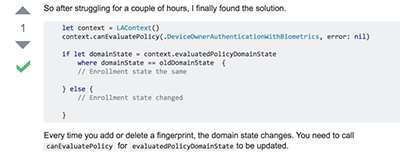 當你增加或者刪除指紋時候,你在使用使用canEvaluatePolicy(_:error:)或者evaluatePolicy(_:localizedReason:reply:)方法驗證;成功后evaluatedPolicyDomainState屬性會返回一個 NSData 對象;否則返回 nil;