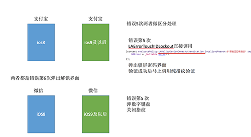 iOS 9 之前是沒有LAErrorTouchIDLockout鎖定這個選項的,默認錯誤5次后;第6次驗證是自動彈出輸入密碼界面;