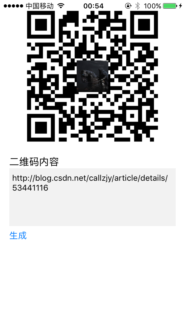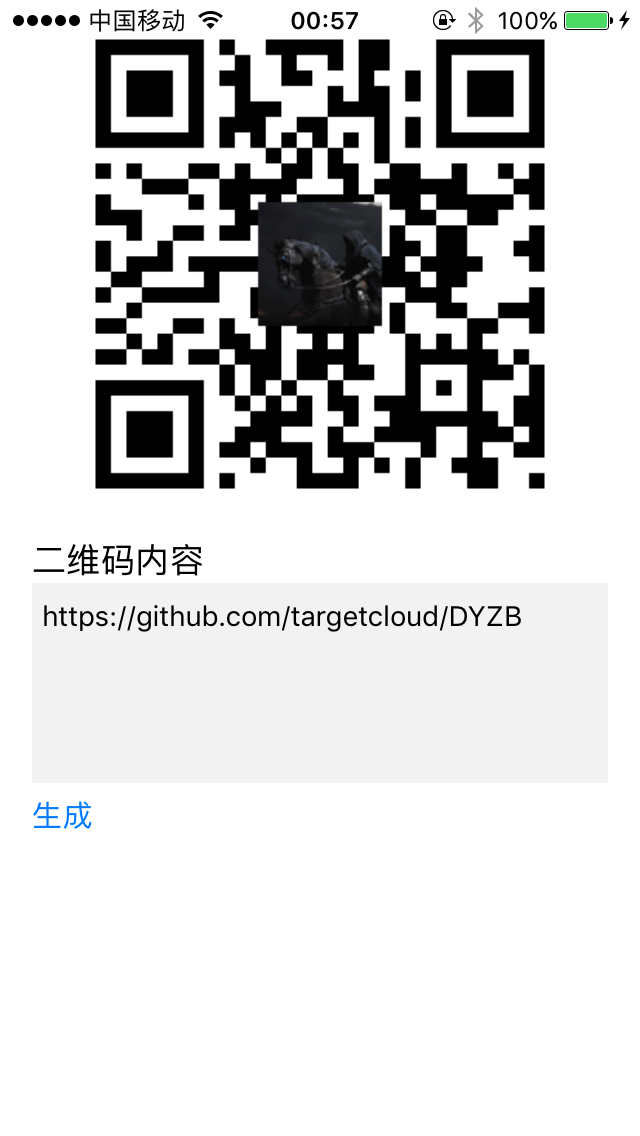 // // ViewController.swift // GeneratorQRCode // // Created by targetcloud on 2016/12/3. // Copyright © 2016年 targetcloud. All rights reserved. // import UIKit class ViewController: UIViewController { @IBOutlet weak var qrImg: UIImageView! @IBOutlet weak var qrContent: UITextView! @IBAction func generatorQRImg(_ sender: Any) { view.endEditing(true) let str = qrContent.text ?? "" let filter = CIFilter(name: "CIQRCodeGenerator") filter?.setDefaults() let data = str.data(using: String.Encoding.utf8) filter?.setValue(data, forKey: "inputMessage") filter?.setValue("M", forKey: "inputCorrectionLevel") var image = filter?.outputImage let transform = CGAffineTransform(scaleX: 10, y: 10)//處理成為一個高清圖片 image = image?.applying(transform) var resultImage = UIImage(ciImage: image!) let centerImg = UIImage(named: "targetcloud.png") resultImage = mergeImage(resultImage, centerImg: centerImg!, drawSize:CGSize(width: 80, height: 80)) qrImg.image = resultImage } func mergeImage(_ sourceImage: UIImage, centerImg: UIImage,drawSize:CGSize) -> UIImage { let size = sourceImage.size UIGraphicsBeginImageContext(size) sourceImage.draw(in: CGRect(x: 0, y: 0, width: size.width, height: size.height)) centerImg.draw(in: CGRect(x: (size.width - drawSize.width) * 0.5, y: (size.height - drawSize.height) * 0.5, width: drawSize.width, height: drawSize.height)) let resultImage = UIGraphicsGetImageFromCurrentImageContext() UIGraphicsEndImageContext() return resultImage! } } 3、運行效果