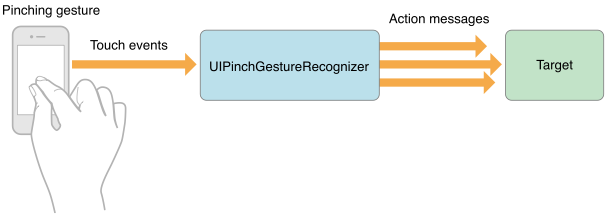 在iOS中,你可以使用系統(tǒng)內(nèi)置的手勢識別(GestureRecognizer),也可以創(chuàng)建自己的手勢.GestureRecognizer將低級別的轉(zhuǎn)換為高級別的執(zhí)行行為,是你綁定到view的對象,當(dāng)發(fā)生手勢,綁定到的view對象會響應(yīng),它確定這個動作是否對應(yīng)一個特定的手勢(swipe,pinch,pan,rotation).如果它能識別這個手勢,那么就會向綁定它的view發(fā)送消息,如下圖