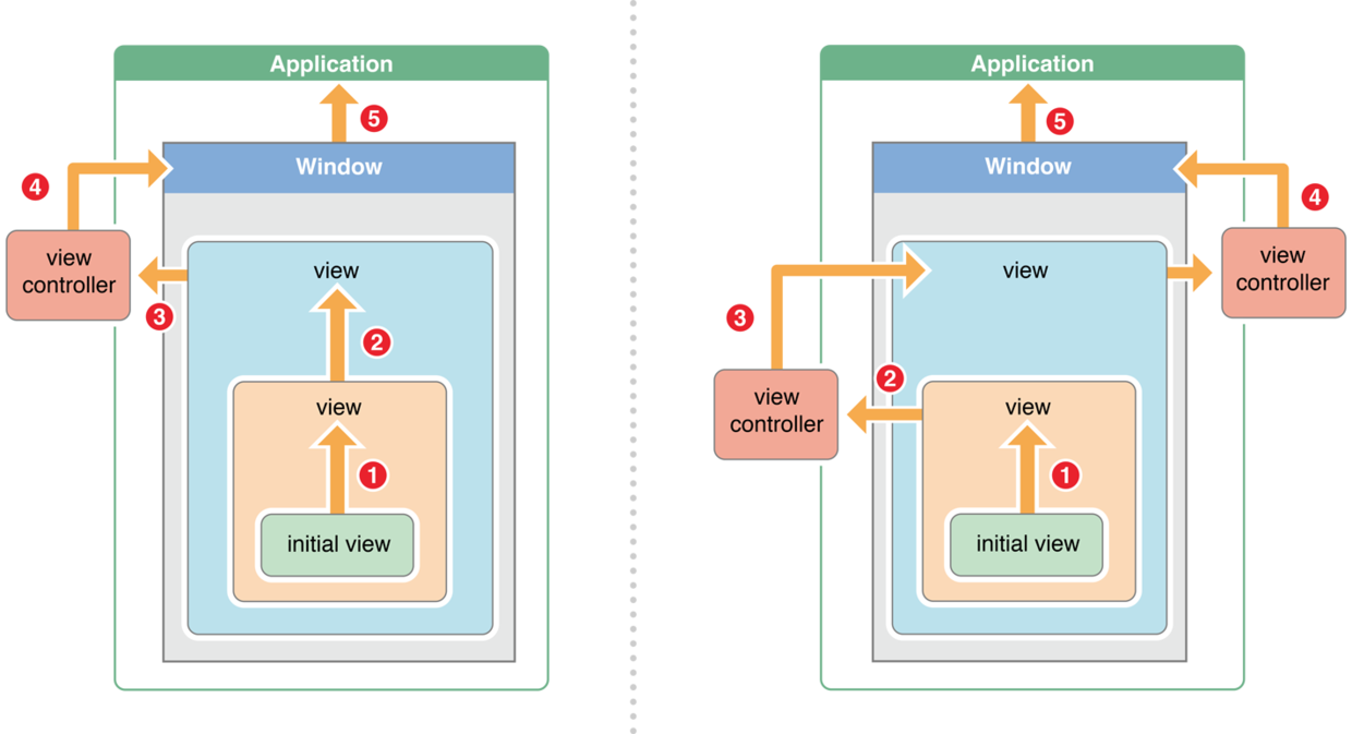 那么事件響應(yīng)鏈與UIResponder有什么關(guān)系呢?應(yīng)用內(nèi)的視圖按一定的結(jié)構(gòu)組織起來,即樹狀層次結(jié)構(gòu),一個(gè)視圖可以有多個(gè)子視圖,而子視圖只能有一個(gè)父視圖。當(dāng)一個(gè)視圖被添加到父視圖上時(shí)。每一個(gè)視圖的nextResponder屬性就指向它的父視圖,這樣,整個(gè)應(yīng)用就通過nextResponder串成了一條鏈,即響應(yīng)鏈。響應(yīng)鏈?zhǔn)且粋€(gè)虛擬鏈,并不是真實(shí)存在的,它借助UIResponder的nextResponder串連起來。如下圖
