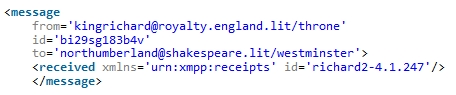 NSString *siID = [XMPPStream generateUUID]; //發送消息 XMPPMessage *message = [XMPPMessage messageWithType:@"chat" to:jid elementID:siID]; NSXMLElement *receipt = [NSXMLElement elementWithName:@"request" xmlns:@"urn:xmpp:receipts"]; [message addChild:receipt]; [message addBody:@"測試"]; [self.xmppStream sendElement:message];
