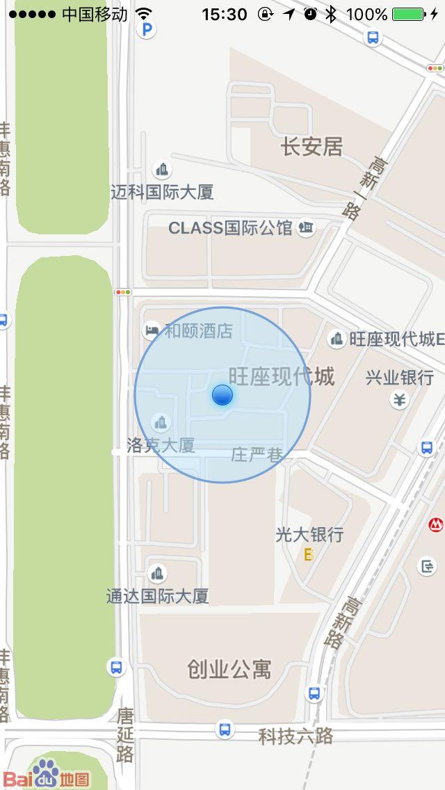 #import "ViewController.h"#import <BaiduMapAPI_Map/BMKMapView.h>#import <BaiduMapAPI_Location/BMKLocationService.h>@interface ViewController ()<BMKLocationServiceDelegate,BMKMapViewDelegate>@property (nonatomic,strong) BMKMapView *mapView;//地圖視圖@property (nonatomic,strong) BMKLocationService *service;//定位服務@end@implementation ViewController- (void)viewDidLoad { [super viewDidLoad]; //初始化地圖 self.mapView = [[BMKMapView alloc] initWithFrame:self.view.frame]; self.mapView.delegate =self; //添加到view上 [self.view addSubview:self.mapView]; //初始化定位 self.service = [[BMKLocationService alloc] init]; //設置代理 self.service.delegate = self; //開啟定位 [self.service startUserLocationService]; // Do any additional setup after loading the view, typically from a nib.}#pragma mark -------BMKLocationServiceDelegate /** *用戶位置更新后,會調用此函數 *@param userLocation 新的用戶位置 */- (void)didUpdateBMKUserLocation:(BMKUserLocation *)userLocation { //展示定位 self.mapView.showsUserLocation = YES; //更新位置數據 [self.mapView updateLocationData:userLocation]; //獲取用戶的坐標 self.mapView.centerCoordinate = userLocation.location.coordinate; self.mapView.zoomLevel =18;}運行結果