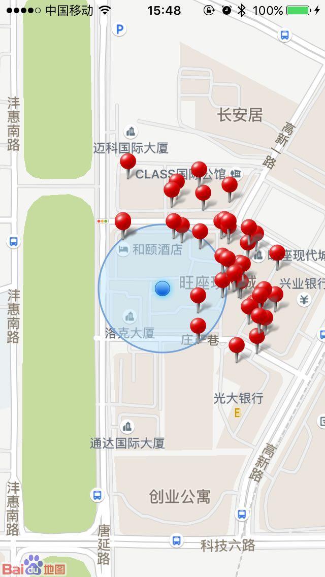 #import "ViewController.h"#import <BaiduMapAPI_Map/BMKMapView.h>#import <BaiduMapAPI_Location/BMKLocationService.h>#import <BaiduMapAPI_Search/BMKPoiSearch.h>#import <BaiduMapAPI_Map/BMKAnnotation.h>#import <BaiduMapAPI_Map/BMKPointAnnotation.h>#import <BaiduMapAPI_Map/BMKPinAnnotationView.h>#define kWidth [UIScreen mainScreen].bounds.size.width@interface ViewController ()<BMKLocationServiceDelegate,BMKPoiSearchDelegate,BMKMapViewDelegate>@property (nonatomic,strong) BMKMapView *mapView;//地圖視圖@property (nonatomic,strong) BMKLocationService *service;//定位服務@property (nonatomic,strong) BMKPoiSearch *poiSearch;//搜索服務@property (nonatomic,strong) NSMutableArray *dataArray;@end@implementation ViewController- (NSMutableArray *)dataArray { if (!_dataArray) { _dataArray = [NSMutableArray array]; } return _dataArray;}- (void)viewDidLoad { [super viewDidLoad]; //初始化地圖 self.mapView = [[BMKMapView alloc] initWithFrame:self.view.frame]; self.mapView.delegate =self;// //設置地圖的顯示樣式// self.mapView.mapType = BMKMapTypeSatellite;//衛星地圖// // //設置路況// self.mapView.trafficEnabled = YES;// // //底圖poi標注// self.mapView.showMapPoi = NO;// // //在手機上當前可使用的級別為3-21級// self.mapView.zoomLevel = 21;// // //旋轉// self.mapView.rotateEnabled = NO;// // //拖拽// self.mapView.scrollEnabled = NO;// [self.view addSubview:self.mapView]; //初始化定位 self.service = [[BMKLocationService alloc] init]; //設置代理 self.service.delegate = self; //開啟定位 [self.service startUserLocationService]; // Do any additional setup after loading the view, typically from a nib.}#pragma mark -------BMKLocationServiceDelegate /** *用戶位置更新后,會調用此函數 *@param userLocation 新的用戶位置 */- (void)didUpdateBMKUserLocation:(BMKUserLocation *)userLocation { //展示定位 self.mapView.showsUserLocation = YES; //更新位置數據 [self.mapView updateLocationData:userLocation]; //獲取用戶的坐標 self.mapView.centerCoordinate = userLocation.location.coordinate; self.mapView.zoomLevel =18; //初始化搜索 self.poiSearch =[[BMKPoiSearch alloc] init]; self.poiSearch.delegate = self; //初始化一個周邊云檢索對象 BMKNearbySearchOption *option = [[BMKNearbySearchOption alloc] init]; //索引 默認為0 option.pageIndex = 0; //頁數默認為10 option.pageCapacity = 50; //搜索半徑 option.radius = 200; //檢索的中心點,經緯度 option.location = userLocation.location.coordinate; //搜索的關鍵字 option.keyword = @"小吃"; //根據中心點、半徑和檢索詞發起周邊檢索 BOOL flag = [self.poiSearch poiSearchNearBy:option]; if (flag) { NSLog(@"搜索成功"); //關閉定位 [self.service stopUserLocationService]; } else { NSLog(@"搜索失敗"); }}#pragma mark -------BMKPoiSearchDelegate/** *返回POI搜索結果 *@param searcher 搜索對象 *@param poiResult 搜索結果列表 *@param errorCode 錯誤號,@see BMKSearchErrorCode */- (void)onGetPoiResult:(BMKPoiSearch *)searcher result:(BMKPoiResult *)poiResult errorCode:(BMKSearchErrorCode)errorCode { //若搜索成功 if (errorCode ==BMK_SEARCH_NO_ERROR) { //POI信息類 //poi列表 for (BMKPoiInfo *info in poiResult.poiInfoList) { [self.dataArray addObject:info]; //初始化一個點的注釋 //只有三個屬性 BMKPointAnnotation *annotoation = [[BMKPointAnnotation alloc] init]; //坐標 annotoation.coordinate = info.pt; //title annotoation.title = info.name; //子標題 annotoation.subtitle = info.address; //將標注添加到地圖上 [self.mapView addAnnotation:annotoation]; } }}/** *返回POI詳情搜索結果 *@param searcher 搜索對象 *@param poiDetailResult 詳情搜索結果 *@param errorCode 錯誤號,@see BMKSearchErrorCode */- (void)onGetPoiDetailResult:(BMKPoiSearch *)searcher result:(BMKPoiDetailResult *)poiDetailResult errorCode:(BMKSearchErrorCode)errorCode { NSLog(@"%@",poiDetailResult.name);}#pragma mark -------------BMKMapViewDelegate/** *根據anntation生成對應的View *@param mapView 地圖View *@param annotation 指定的標注 *@return 生成的標注View */- (BMKAnnotationView *)mapView:(BMKMapView *)mapView viewForAnnotation:(id<BMKAnnotation>)annotation { //如果是注釋點 if ([annotation isKindOfClass:[BMKPointAnnotation class]]) { //根據注釋點,創建并初始化注釋點視圖 BMKPinAnnotationView *newAnnotation = [[BMKPinAnnotationView alloc] initWithAnnotation:annotation reuseIdentifier:@"an"]; //設置大頭針的顏色 newAnnotation.pinColor = BMKPinAnnotationColorRed; //設置動畫 newAnnotation.animatesDrop = YES; return newAnnotation; } return nil;}/** *當選中一個annotation views時,調用此接口 *@param mapView 地圖View *@param views 選中的annotation views */- (void)mapView:(BMKMapView *)mapView didSelectAnnotationView:(BMKAnnotationView *)view { //poi詳情檢索信息類 BMKPoiDetailSearchOption *option = [[BMKPoiDetailSearchOption alloc] init]; BMKPoiInfo *info = self.dataArray.firstObject; //poi的uid,從poi檢索返回的BMKPoiResult結構中獲取 option.poiUid = info.uid; /** *根據poi uid 發起poi詳情檢索 *異步函數,返回結果在BMKPoiSearchDelegate的onGetPoiDetailResult通知 *@param option poi詳情檢索參數類(BMKPoiDetailSearchOption) *@return 成功返回YES,否則返回NO */ BOOL flag = [self.poiSearch poiDetailSearch:option]; if (flag) { NSLog(@"檢索成功"); } else { NSLog(@"檢索失敗"); } }運行結果
