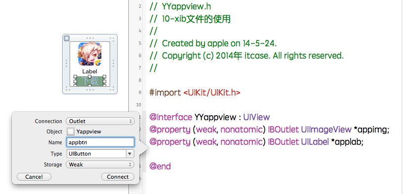 #import <UIKit/UIKit.h>@interface YYappview : UIView@property (strong, nonatomic) IBOutlet UIImageView *appimg;@property (strong, nonatomic) IBOutlet UILabel *applab;@property (strong, nonatomic) IBOutlet UIButton *appbtn;@end