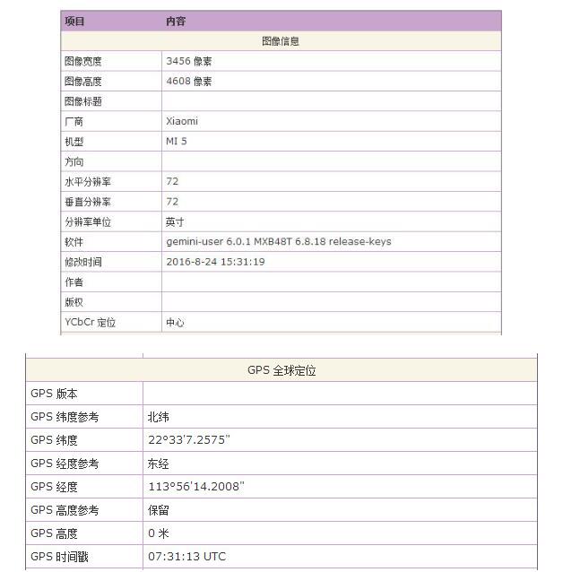 在某Exif查看器上對(duì)手機(jī)拍攝的照片進(jìn)行了試驗(yàn),結(jié)果顯示只要圖片未被壓縮,日期時(shí)間、拍照設(shè)備型號(hào)、像素以及光圈快門等信息都能記錄下來,而位置信息則需要用戶打開GPS才能展現(xiàn)出來。
