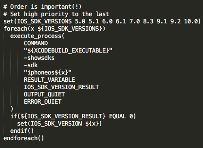 沿著提示發(fā)現(xiàn),前面的是打印錯誤的,后面的才是出錯的問題,iphone.cmake內(nèi)部錯誤地方如下圖