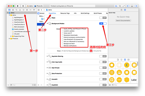 在Xcode里選中當(dāng)前的target,選擇Capabilities,找到Background Modes,打開它,在里面選擇對應(yīng)權(quán)限