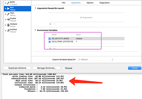 如果我們想知道程序啟動的時間,則可以在工程的scheme中添加環(huán)境變量DYLD_PRINT_STATISTICS。調(diào)試過程中可以在控制臺打印出程序啟動過程中各個階段所消耗的時間。