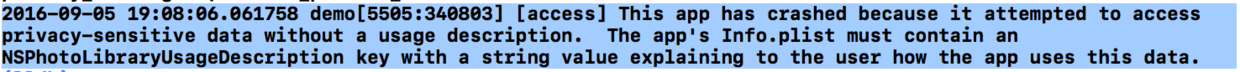 我們需要打開info.plist文件添加相應(yīng)權(quán)限的說明,否則程序在iOS10上會出現(xiàn)崩潰。你的項目中訪問了隱私數(shù)據(jù),比如:相機,相冊,聯(lián)系人等,在Xcode8中打開編譯的話,統(tǒng)統(tǒng)會crash,控制臺會輸出下面這樣的日志: