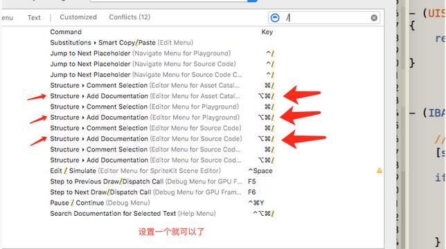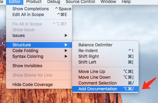 注意:Xcode8內(nèi)置了開啟注釋的功能,位置在這里