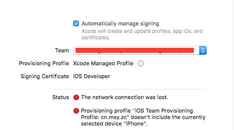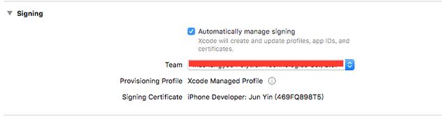 用Xcode8打開工程后,比較明顯的就是下圖了,這個(gè)是蘋果的新特性,可以幫助我們自動(dòng)管理證書。建議大家勾選這個(gè)Automatically manage signing(Ps.但是在beat2版本我用的時(shí)候,完全不可以,GM版本竟然神奇的又好了。)