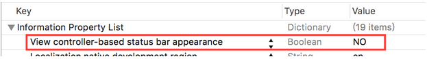 注意:添加的View controller-based status bar appearance是Bool類型,默認(rèn)為Yes,很不幸iOS9之后蘋果已經(jīng)不推薦使用這些方法了,這些方法能用但是會報(bào)警告。
