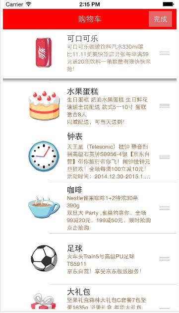 // ViewController.m// JRTableView刪除//// Created by jerehedu on 15/6/11.// Copyright (c) 2015年 jerehedu. All rights reserved.//#import "ViewController.h"#import "Goods.h"@interface ViewController ()<UITableViewDataSource, UITableViewDelegate>{ UITableView *_tableView; //列表 NSMutableArray *_goodsAry; //商品數組 UIButton *_editBtn; //編輯按鈕}@end@implementation ViewController- (void)viewDidLoad { [super viewDidLoad]; //添加標題 UILabel *titleLabel = [[UILabel alloc] initWithFrame:CGRectMake(0, 20, self.view.frame.size.width, 44)]; titleLabel.text = @"購物車"; titleLabel.textAlignment = NSTextAlignmentCenter; titleLabel.backgroundColor = [UIColor redColor]; titleLabel.textColor = [UIColor whiteColor]; [self.view addSubview:titleLabel]; //添加編輯按鈕 _editBtn = [UIButton buttonWithType:UIButtonTypeCustom]; _editBtn.frame = CGRectMake(self.view.frame.size.width-60, 25, 50, 34); [_editBtn setTitle:@"編輯" forState:UIControlStateNormal]; [_editBtn setTitle:@"完成" forState:UIControlStateSelected]; _editBtn.titleLabel.font = [UIFont systemFontOfSize:15]; _editBtn.backgroundColor = [UIColor colorWithRed:0.8 green:0.8 blue:0.8 alpha:0.5]; [self.view addSubview:_editBtn]; [_editBtn addTarget:self action:@selector(clickEditBtn:) forControlEvents:UIControlEventTouchUpInside]; //添加tableview _tableView = [[UITableView alloc] initWithFrame:CGRectMake(0, 64, self.view.frame.size.width, self.view.frame.size.height-64)]; _tableView.dataSource = self; _tableView.delegate = self; [self.view addSubview:_tableView]; //取數據 NSArray *ary = [NSArray arrayWithContentsOfFile:[[NSBundle mainBundle] pathForResource:@"ShoppingGoodsList" ofType:@"plist"]]; //把數據存到模型對象中,然后把對象存到數組中 _goodsAry = [NSMutableArray array]; for (int i=0; i<ary.count; i++) { Goods *good = [Goods goodsWithDic:ary[i]]; [_goodsAry addObject:good]; }}#pragma mark 數據源 返回有幾行-(NSInteger)tableView:(UITableView *)tableView numberOfRowsInSection:(NSInteger)section{ return _goodsAry.count;}#pragma mark 每行顯示內容-(UITableViewCell*)tableView:(UITableView *)tableView cellForRowAtIndexPath:(NSIndexPath *)indexPath{ static NSString *idGood = @"goods"; UITableViewCell *cell = [tableView dequeueReusableCellWithIdentifier:idGood]; if (cell==nil) { cell = [[UITableViewCell alloc] initWithStyle:UITableViewCellStyleSubtitle reuseIdentifier:idGood]; } Goods *good = _goodsAry[indexPath.row]; cell.imageView.image = [UIImage imageNamed:good.icon]; cell.textLabel.text = good.name; cell.detailTextLabel.text = good.details; cell.detailTextLabel.numberOfLines = 6; cell.detailTextLabel.textColor = [UIColor brownColor]; return cell;}#pragma mark 選中行-(void)tableView:(UITableView *)tableView didSelectRowAtIndexPath:(NSIndexPath *)indexPath{ // 取消選中狀態 [tableView deselectRowAtIndexPath:indexPath animated:YES];}#pragma mark 設置行高-(CGFloat)tableView:(UITableView *)tableView heightForRowAtIndexPath:(NSIndexPath *)indexPath{ return 110;}#pragma mark 點擊編輯按鈕- (IBAction)clickEditBtn:(UIButton *)sender { //設置tableview編輯狀態 BOOL flag = !_tableView.editing; [_tableView setEditing:flag animated:YES]; _editBtn.selected = flag;}#pragma mark 選擇編輯模式,添加模式很少用,默認是刪除-(UITableViewCellEditingStyle)tableView:(UITableView *)tableView editingStyleForRowAtIndexPath:(NSIndexPath *)indexPath{ return UITableViewCellEditingStyleNone;}#pragma mark 排序 當移動了某一行時候會調用//編輯狀態下,只要實現這個方法,就能實現拖動排序-(void)tableView:(UITableView *)tableView moveRowAtIndexPath:(NSIndexPath *)sourceIndexPath toIndexPath:(NSIndexPath *)destinationIndexPath{ // 取出要拖動的模型數據 Goods *goods = _goodsAry[sourceIndexPath.row]; //刪除之前行的數據 [_goodsAry removeObject:goods]; // 插入數據到新的位置 [_goodsAry insertObject:goods atIndex:destinationIndexPath.row];}@end以上就是本文的全部內容,希望對大家的學習有所幫助,也希望大家多多支持武林網。