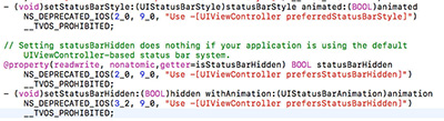 不過該方法使用壽命就到iOS9了,iOS10徹底不能用了。要想以后iOS10也能保持statusBar的正確顯示,就按下圖接口備注的來改吧。估計改動會比較多,那又有什么辦法呢,蘋果爸爸就給你指定好規則了,你就老實的跟著走吧。