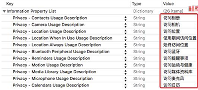 <!-- 相冊 --> <key>NSPhotoLibraryUsageDescription</key> <string>App需要您的同意,才能訪問相冊</string> <!-- 相機(jī) --> <key>NSCameraUsageDescription</key> <string>App需要您的同意,才能訪問相機(jī)</string> <!-- 麥克風(fēng) --> <key>NSMicrophoneUsageDescription</key> <string>App需要您的同意,才能訪問麥克風(fēng)</string> <!-- 位置 --> <key>NSLocationUsageDescription</key> <string>App需要您的同意,才能訪問位置</string> <!-- 在使用期間訪問位置 --> <key>NSLocationWhenInUseUsageDescription</key> <string>App需要您的同意,才能在使用期間訪問位置</string> <!-- 始終訪問位置 --> <key>NSLocationAlwaysUsageDescription</key> <string>App需要您的同意,才能始終訪問位置</string> <!-- 日歷 --> <key>NSCalendarsUsageDescription</key> <string>App需要您的同意,才能訪問日歷</string> <!-- 提醒事項 --> <key>NSRemindersUsageDescription</key> <string>App需要您的同意,才能訪問提醒事項</string> <!-- 運(yùn)動與健身 --> <key>NSMotionUsageDescription</key> <string>App需要您的同意,才能訪問運(yùn)動與健身</string> <!-- 健康更新 --> <key>NSHealthUpdateUsageDescription</key> <string>App需要您的同意,才能訪問健康更新 </string> <!-- 健康分享 --> <key>NSHealthShareUsageDescription</key> <string>App需要您的同意,才能訪問健康分享</string> <!-- 藍(lán)牙 --> <key>NSBluetoothPeripheralUsageDescription</key> <string>App需要您的同意,才能訪問藍(lán)牙</string> <!-- 媒體資料庫 --> <key>NSAppleMusicUsageDescription</key> <string>App需要您的同意,才能訪問媒體資料庫</string>或者